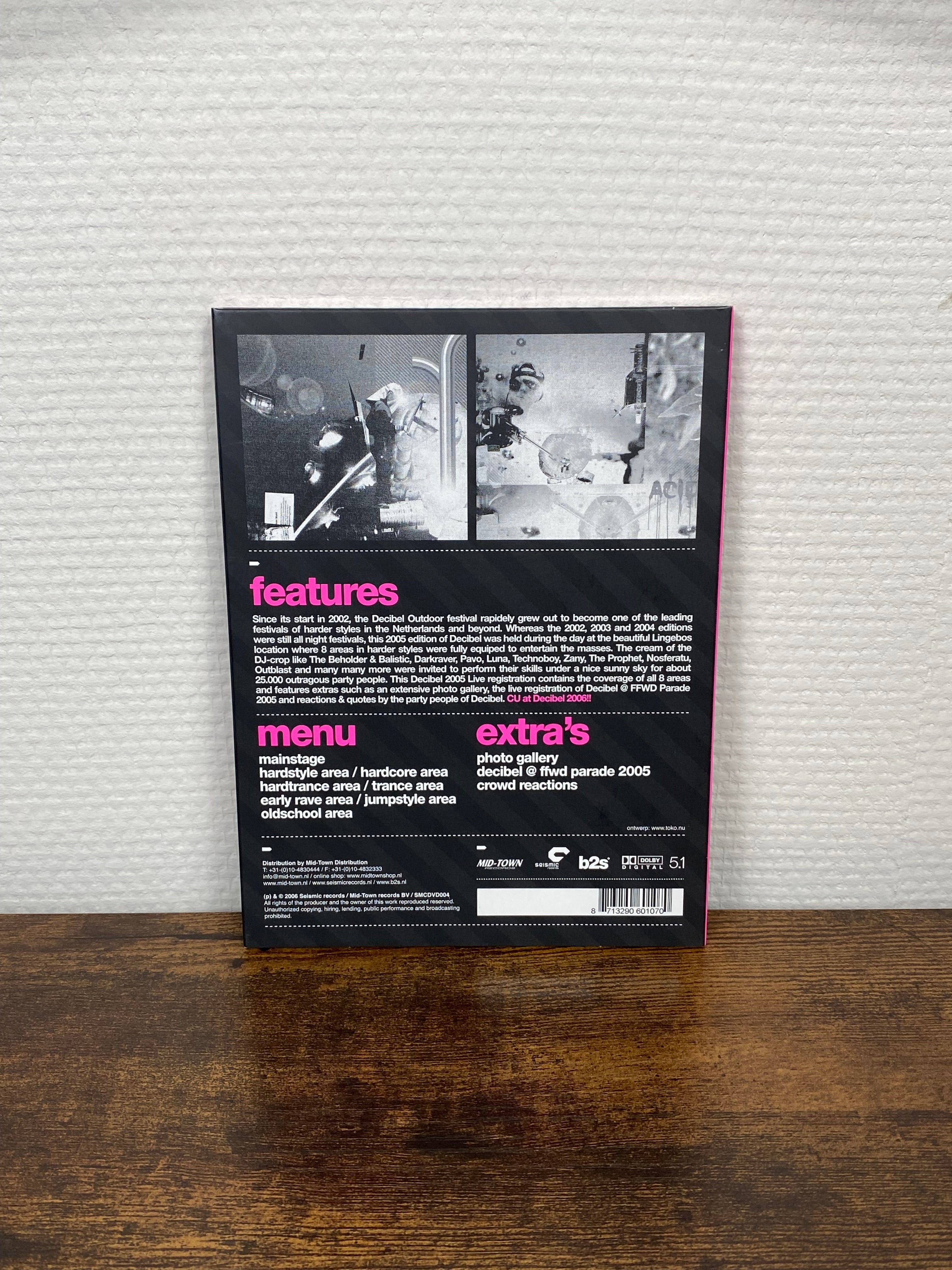 • Condition Disc: MINT (NEW)• Condition Case: MINT (NEW, pen mark on the front)• Label: Seismic Records (2) – SMCDVD004• Series: Decibel (4) – 2005• Country: Netherlands• Released: 2006• Format: DVD• Style: Gabber, Hard Trance, Hardcore, Hardstyle, Jumpstyle, Techno